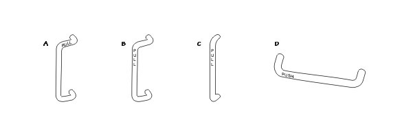 ROUND MATERIAL | FLAT MATERIAL | | 3/4" Dia. | 1" Dia. | 1-1/4" Dia. | 3/4" High | 1" High | 1-1/4" H | | PUSH or PULL | 35.20 | 36.75 | 37.80 | 30.50 | 31.20 | 37.80 | | POUSSEZ | 44.10 | 47.25 | 49.35 | 52.50 | 55.40 | 66.20 | | TIREZ | 38.85 | 40.95 | 43.05 | 39.40 | 42.50 | 50.90 | FEMALE PICTO | 3-1/2" HIGH | 35.20 | MALE PICTO | 3-1/2" HIGH | 35.20 | HANDICAP PICTO | 3-1/2" HIGH | 39.40 | SPECIAL ENGRAVING PRICES ON APPLICATION. ALL ENGRAVINGS ARE PAINTED IN BLACK. STANDARD. |
